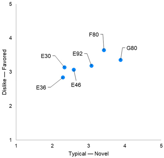 The relationship between consumer perceptions of innovation and consumer preference for a particular brand or product was found in this study. The samples were collected from the images of BMW M3 series vehicles as the experimental sample to evaluate “Typical-Novel” and “Dislike-Favored”. To evaluate consumer perception of the vehicles, a questionnaire survey was conducted using the Semantic Differential Scale [16]. In the survey, the images of the BMW M3 model in the sixth generation were shown regarding research typicality and consumer preference. A total of 200 valid questionnaires were collected from 147 males and 53 females. In the data analysis, we obtained scores for consumer perception of the vehicle as depicted in Table 1. E36 scored the lowest (2.295). The key characteristics of the remaining five M3 models (E30, E46, E92, F80, and G80) were also scored in terms of innovation in the design of the front images. As shown in Figure 4, the order of consumer preference was E46, E30, E92, and F80. A substantial decline was found for G80 as it showed a significant decrease in favorability and innovation compared to the scores of other models: 10% (E46), 20% (E30), 40% (E92), and 50% (F80). To maintain the appropriate level of consumer preference, the innovation of the front images compared to the most typical M3 model E36 was required.