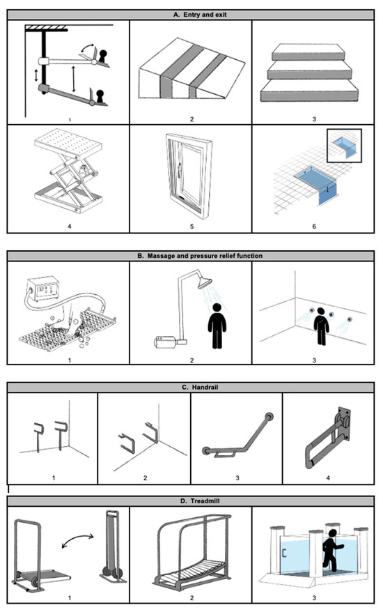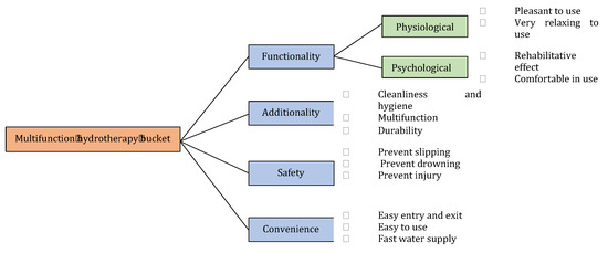 Generally speaking, regardless of the fact that the appearance and components of a product are always considered by many consumers as purchase factors, the product set up in this study is a multi-functional hydrotherapy bucket, so users’ decisions are mostly based on the function, efficacy, practicality, ease of operation, durability, price, size, and other factors for purchase considerations rather than the appearance or the shape. The morphological diagram method is divided into four parts after disassembling the individual components and functions. First of all, Figure 2A shows the different ways of entering and leaving the bucket. Figure 2B is mainly for different massage and pressure relief functions. Figure 2C shows the handrails of different directions, sizes, and shapes. Figure 2D is the treadmill devices used for running or walking training.