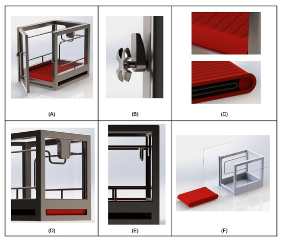 After generating the best design solution according to the above methodologies, the main design concept is D. Concept D enhances the function of combination and storage, because its massage and pressure relief functions and treadmill are detachable and storable, so it enhances the ideal of multiple functions of the bucket. Figure 3A–F show the detailed 3D drawing of each component. This product has a water-blocking door with a side anti-leakage plastic strip, so it can achieve the effect of preventing water leakage (Figure 3A). The two-stage closing function can enhance the tightness of the door plate and the hydrotherapy bucket (Figure 3B). Figure 3C combines the air foam cushion with the treadmill, so users can perform running and walking training at the same time as receiving the effect of a massage. In addition, this device can instantly eject small bubbles, a micro-vibration of about 10,000~15,000 times per second, to achieve the massage effect. Figure 3D shows a monitor, which is operated by the therapist and monitored externally, while Figure 3E shows a monitor that can be operated directly by the user from inside. Figure 3F is a schematic diagram of the treadmill and the air foam cushion that can be disassembled and stored.