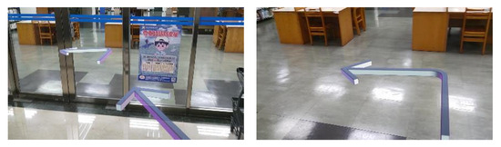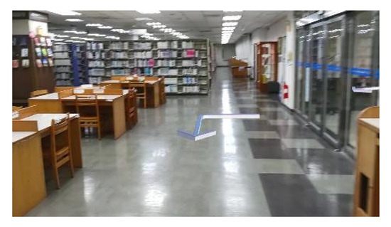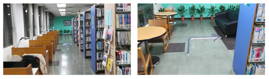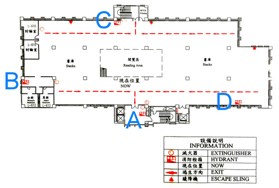 There are many paper books in libraries. If there is a fire, the books are at risk of producing a lot of thick smoke, which may hinder firefighters from finding the locations of fire hose boxes, safety exits, fire extinguishers, and/or fire escape equipment. Therefore, we used the 6F stack of the library of the Chaoyang University of Technology (Figure 2) as the location to conduct the spatial information embedding experiment of BIGS.
