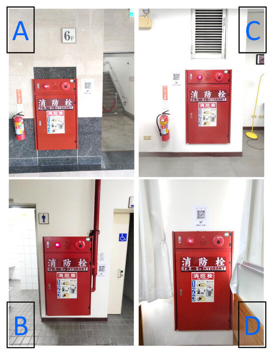 The photos of the four fire hose hydrant boxes labeled with A, B, C, and D in Figure 3.