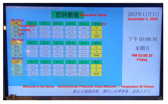 The Chaoyang University of Technology is establishing an innovative campus and has built many real-time monitoring systems for electric energy consumption, air quality, and indoor temperature (Figure 9). In the future, if BIGS can be pre-built in each campus corner, it can help firefighters or rescue personnel complete tasks quickly and accurately if/when a disaster occurs.