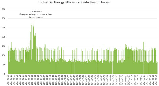 The number of searches for “industrial energy conservation” reached its maximum between May and September 2014. As relevant policies during that period, the State Council issued the Action Plan on 15 May 2014. This plan aimed to achieve annual reductions of 3.9% in energy consumption per unit of GDP, 2% in chemical oxygen demand, 2% in sulfur dioxide, 2% in ammonia nitrogen, and 5% in nitrogen oxide emissions set in 2014 and 2015. Additionally, the plan targeted a 4 and 3.5% reduction in carbon dioxide emissions per unit of GDP in the two years. Since its introduction, this plan garnered significant public attention and response. In addition, the official website of the Chinese government provided an in-depth analysis of related policies. Consequently, there was a substantial increase in the number of searches.