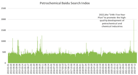 The petrochemical industry is important and has high industrial relevance and a wide range of product coverage in China. However, as the economy develops, the demand for ecological and environmental protection increases, necessitating the green transformation of the petrochemical industry. In 2012, governments at various levels recognized this issue and began taking measures for the improvement of urban green development. The Yangzhou Municipal Government issued “Opinions” on 10 September 2012, outlining their plans. Subsequently, in 2016, the Hubei Province released the Petrochemical Industry Transformation Plan. The number of related searches with the keyword “petrochemical” is presented in Figure 2. The number of searches related to “petrochemical” remained relatively stable over time. However, there were periods when the number of searches increased. As the petrochemical industry has always been a subject of great interest and received attention from the public and government, changes in policies or significant events related to the industry led to a sudden surge in public attention.