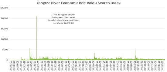 Since September 2013, the “Yangtze River Economic Belt” gradually gained attention from the public. The Belt covers 11 provinces and municipalities, including Shanghai, Jiangsu, Zhejiang, Anhui, Jiangxi, Hubei, Hunan, Chongqing, Sichuan, Yunnan, and Guizhou, spanning the eastern, central, and western regions. They have significantly contributed to China’s economic growth. On 21 July 2013, during an inspection visit to Wuhan, General Secretary Xi Jinping emphasized the strengthening of cooperation in the Yangtze River basin for inland water transportation and transforming the entire basin into a “golden waterway”. Figure 3 displays the number of searches with the keyword “Yangtze River Economic Belt”.