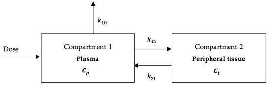 dCp/dt = Dose − (k10 + k12)Cp + k21Ct,