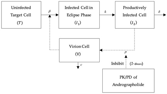 Andrographolide inhibited RNA replication in the life cycle of viruses. RNA was replicated at a rate of p. Thus, the viral dynamic model was adjusted by the PK/PD of andrographolide, as shown in Figure 4.