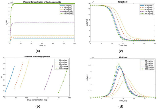 Numerical solution of PK/PD model and viral dynamic model of COVID-19 with andrographolide treatment in (a) the plasma concentration of drug dosage, (b) the effective of drug dosage, (c) the quantitative of target cell, and (d) the quantitative of viral cell.