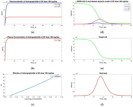 Numerical solution of PK/PD model and viral dynamic model of COVID-19 with a dose of 180 mg per day of andrographolide: (a) pharmacokinetics of daily dose of 180, (b) plasma concentration of andrographolide, (c) efficacy of andrographolide at IC50, (d) number of COVID-19 cells, (e) number of uninfected target cell, and (f) viral load of viral dynamics model.