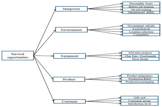 Nineteen subjects including ten consultants and nine university professors were asked to complete a questionnaire that elicited information on their attitudes and professional knowledge of running a franchise store. The subjects, aged fifty to sixty years old, came from different provinces in China. For the present research, Figure 1 describes the framework for survival opportunities with five main evaluation dimensions: manpower, environment, equipment, product, and customer strategies related to beverage service to headquarters in Taiwan. The framework aims to test service quality and performance.