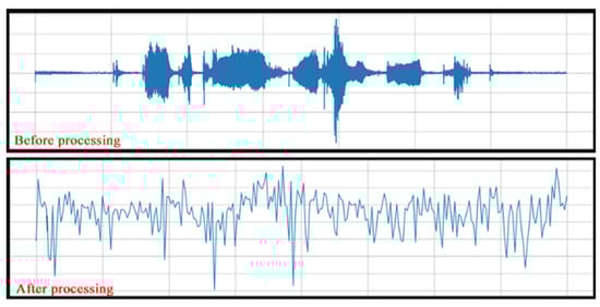 The sound interval of Hua Chao opera, such as more step-in, less jump-in, regular rhythm, and high-frequency signal transmission, can easily weaken []. Based on the audio sample collection of vocal skills, volume, environment, and radio effect, the signal frequency varies, and a large number of speech signals are piled up in the low-frequency and high-frequency parts. The low-frequency part of the value gap is the large spectrum tilt (Spectral Tilt). The speech signal was taken through a high-pass filter method, a differential first-order signal value to reduce the high-frequency part (high-frequency change position) differential value and increase the low-frequency part (low-frequency change position) differential value so that the speech spectrum maintained a stable state (Figure 2, Equation (1)).