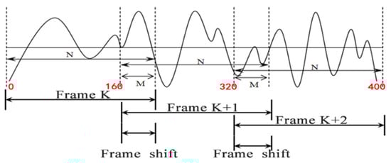 The voice in Hua Chao opera is simple and healthy, the lyrics are catchy, and the voice signal changes slowly. The frequency in the voice signal after pre-emphasis becomes unstable with the change in time, so it needs to be processed in frames. However, the length of frames must not be too long or short. An excessive length reduces the time resolution, while a short length aggravates the cost of operation. As the speech signal sampling frequency was 16 kHz, the standard resolution was 25 ms, and the frame length of 16 kHz signal had 0.025 × 16,000 = 400 samples (the chart unit is N). As the frameshift in the speech signal is usually 10 ms, there were 0.01 × 16,000 = 160 samples in the frame []. The difference between frame length and frameshift in the overlapping area in the speech signal, the so-called “frame iteration”, accounted for about 1/3 of each frame, that is, 400 – 160 = 240 samples (the chart unit is M). The main role of the 240 samples was to maintain the frame number difference. The starting value of the speech frame with 400 sample points was 0, the starting value of the second speech frame was 160, and the starting value of the third speech frame was 320 (Figure 3). According to this rule, the frames were divided until the end of the speech signal.