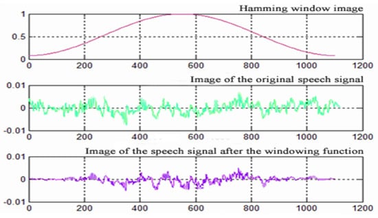 The speech signal of Hua Chao opera is a time series, but the middle domain values are disconnected when carrying out the frame splitting process, which causes the spectral leakage phenomenon. Considering the long-time fluctuation of the speech signal and the disconnection of the endpoints, it is necessary to process its fixed characteristics. Each frame number is substituted into the Hamming Windows function (Hamming Windows), which truncates the original speech sample signal with amplitude–frequency to achieve the finite speech signal and then supplements the continuity of the left end and right end of the frame. By formulating the out-of-window value of the Hamming Windows function as 0 (based on Equation (2)), one takes a generic 0.46 and applies the function to each frame number, the sharp angle in the truncated finite speech signal is blunted, and the waveform amplitude slowly tapers to 0, thus reducing the truncation effect of the speech frames (Figure 4).
