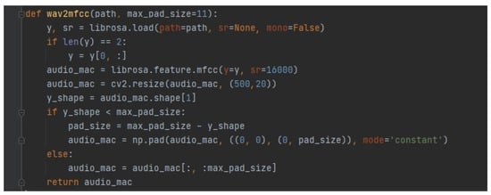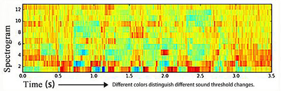 After the speech signal is substituted into the Hamming window function, the individual frames in the signal need to be fast-Fourier-transformed, because the melodic direction of the Hua Dynasty opera tune is rich and variable. It is more difficult to capture its dynamic information when the speech signal belongs to the one-dimensional signal. Thus, the time-domain information cannot be seen as frequency-domain information. Therefore, the speech signal must be processed and output into a 500 × 20 two-dimensional matrix model group as the MFCC matrix model generation code (Figure 5). After that, the speech signal is arranged according to frame, and each frame of speech corresponds to a spectrum using coordinates. In the horizontal coordinate, the duration and vertical coordinate become the decibels of the sound, indicating the relationship between frequency and energy. The amplitude of the speech signal is mapped to a gray-level embodiment, and the amplitude value is proportional to the corresponding gray area. The larger the amplitude value, the darker the corresponding area. The display duration of the speech spectrum is increased to obtain a change over time depicting the sound spectrum of the speech signal (Figure 6 and Figure 7). By doing this, its energy distribution on the spectrum is obtained, and the influence of frequency points higher than the sampled signal is removed to make static and dynamic information parameters more intuitive for the improved robustness of speech signal data acquisition.