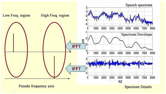 Since Hua Chao opera is sung in the Zijin dialect and its transcription recognition is poor, it is important to perform cepstral analysis on speech signals to extract speech components. The peak resonance peaks on the speech spectrogram carry important sound-recognition properties, while the smooth curve connecting the resonance peaks is called the envelope []. To better identify the acoustic properties of the speech signal, the envelope needs to be separated from the peaks using inverse spectral analysis. Considering the peak as a detail of the spectrum, the horizontal axis is considered as the envelope E of the low-frequency component, which is considered as a sinusoidal signal with four cycles per second, giving a peak at 4 Hz on the coordinate axis. The vertical axis is the spectral detail H[k] of the high-frequency component, which is considered as a sinusoidal signal with 100 cycles. A peak is assigned to the position of 4 Hz on the pseudo-coordinate axis. The vertical axis is the spectral detail of the high-frequency component, H[k], viewed as a sinusoidal signal with 100 cycles per second, and a peak is assigned at 100 Hz on the coordinate axis (Figure 8).