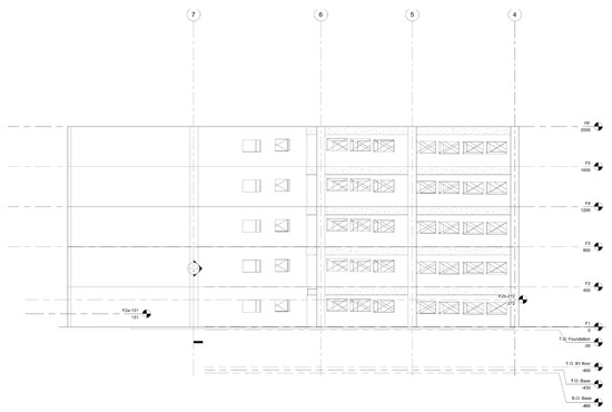 The above method was used to analyze a five floor parking lot space as an example. Its plan view is shown in Figure 3. The ramp design coefficients are shown in Figure 4. The building’s north elevation is shown in Figure 5. The N-S and E-W section profiles are shown in Figure 6 and Figure 7. From the profile map, we define the support beam’s real location and set up the support frame system as shown in Figure 8.