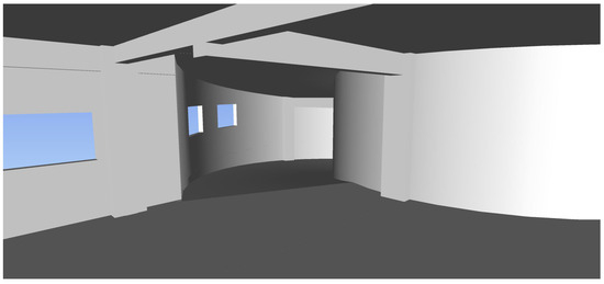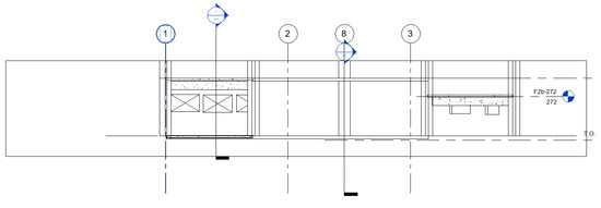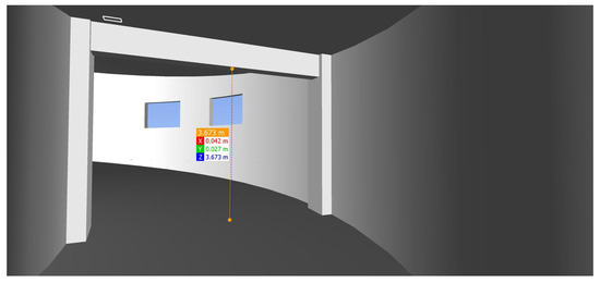 Then, we used a roaming function to traverse the building model and measured the spatial two point distance to obtain the net height space in the structure system (Figure 13). The ramp width was also obtained, as shown in Figure 14. In Figure 13 and Figure 14 red green and blue box mean the measure results for x, y, z axis distance.