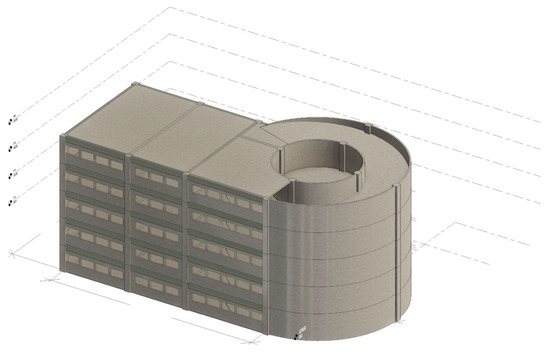 Then, we transferred the model to AutoDesk Navisworks 2021 software, and the whole building model is shown in Figure 11. We simulated the structure system design as shown in Figure 12.