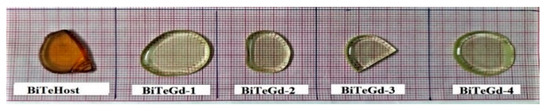 The synthesized Gd3+ tellurite glasses are shown in Figure 1, where Gd2O3 incorporation improved the transparency and changed the color of the glass from reddish-orange to light yellow. Archimedes’ principle was used to determine the density of the sample (Table 1). Physical parameters such as molecular weight and molar volume were calculated for the fabricated glasses with other parameters using the following relations.