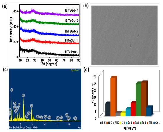 The XRD images of the Gd3+ glasses are shown in Figure 2a. Sharp crystalline peaks were absent in the XRD images, assuring the amorphous nature of the current glasses. In addition, the broad hump observed in Bragg’s angle of 20–30° also reflected the non-crystallinity of the glasses. The surface morphology of Gd3+-doped tellurium borosilicate glass BiTeGd-2 was examined by using SEM images (Figure 2b).