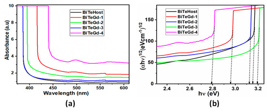 (a) UV-visible absorption spectra and (b) Tauc’s plots drawn for BiTeGd glasses.