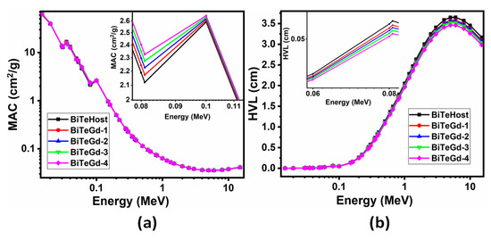(a) MAC and (b) HVL of BiTeGd glasses simulated for energies in 0.015–15 MeV range using Phy-X/PSD software.