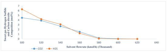 Figure 2 shows that the increase in absorber solvent flowrate decreases the composition of carbon dioxide and hydrogen sulfide in the sweet gas. This implies that the higher the solvent flow, the more efficient the acid gas loading and the lower the carbon dioxide and hydrogen sulfide content in the sweet gas. Hence, the solvent flowrate is inversely proportional to the carbon dioxide and hydrogen sulfide content in the sweet gas.