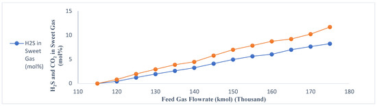 2 in the sweet gas stream. As seen, the increase in feed gas flowrate leads to increased impurity H