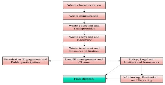 To effectively manage trash and protect both human and environmental health, a waste management framework known as ISWM combines waste prevention, recycling, recovery, and controlled and monitored disposal [5]. Sustainability in all of its dimensions, including environmental, social, and economic, is ISWM’s primary objective. By promoting the reuse and recycling of waste materials, environmental preservation, pollution reduction, and waste generation reduction are all accomplished [6]. It is also important to set targets for waste collection and adopt appropriate approaches when designing new waste management facilities in order to build a sustainable future that balances the needs of the present and safeguards resources for future generations [7]. The flowchart for ISWM is shown in Figure 1.