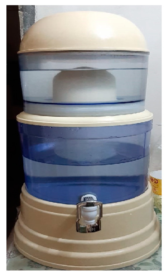 The water sample from the Candle filter (gravity filter) as shown in Figure 3 was collected from the home of an inhabitant of Mohammadpur, Dhaka, which falls into DWASA mod zone 3, on 3 December 2022. The name of the company from which the Candle filter was purchased was Eva Water filter.