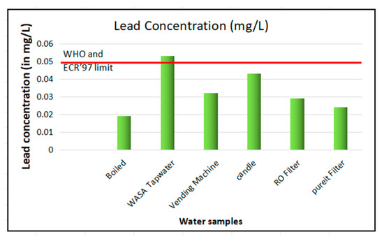 According to ECR’23 and WHO standards, the lead concentration limit for safe drinking water is 0.05mg/L. The lead concentration was tested in the environment laboratory using the equipment Shimadzu AA-6800 FLAAS, which had a minimum detection level of 0.001 mg/L. As we can see from Figure 4, only WASA tap water exceeded the lead concentration limit set by ECR’97 and the WHO standard. Figure 9 shows the lead removing efficiency of each water purification technology.