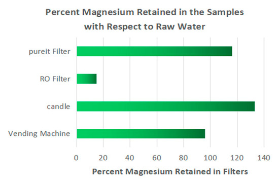 From our overall analysis, we can deduce that, for retaining essential elements, specifically potassium and sodium, the water vending machine shows the least effectiveness. In addition, the vending machine has low chromium-removing efficiency compared to other filters tested. Considering the efficiency of removing cadmium, chromium and lead, the reverse osmosis filter shows the best performance. However, it also removes a significant amount of electrolytes: calcium and magnesium, to be specific. To retain the essential elements and remove the harmful metals from the water samples, the pureit filter has proved to be the most balanced. Along with high lead-removing efficiency and a moderate cadmium-removing efficiency, the pureit filter also retains high percentages of sodium and potassium. Hence, water from the pureit filter is most recommended for safe consumption. The candle filter is the least efficient at removing lead; it also removes calcium and potassium from water to a great extent. A high concentration of sodium and magnesium was found in the filtrate of the candle filter, which is important for maintaining electrolyte concentration in water. If this filtrate water is used for industrial purposes rather than for drinking, then it might prevent pipes from corroding, as these minerals might contribute to form a protective scale on the inner surface of the pipes. Again, for drinking purposes, water has to be boiled prior to filtering through the candle filter to kill micro-organisms.