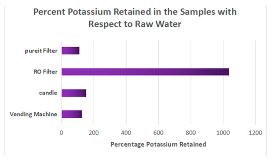 From Figure 12, we see that only the RO filter has a potassium concentration that exceeds the limit set by the Bangladesh standard, which is 12 mg/L. As for the rest of the samples, the potassium concentration is far below the desired level.