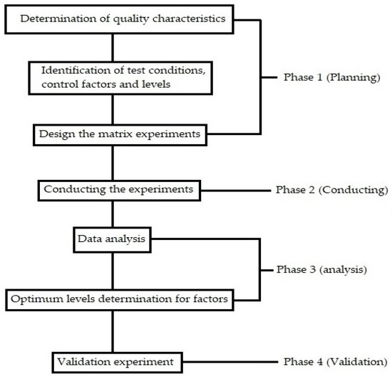 The S/N ratio helps us determine the optimum parameters. The next step is the validation studies, where you can validate or verify the results from a confirmation experiment [11]. The process flow diagram of the Taguchi technique is shown in Figure 1.