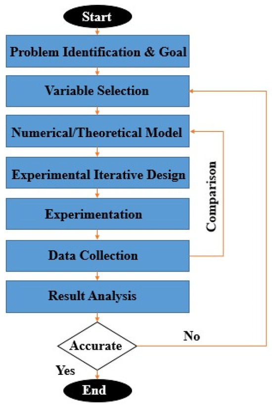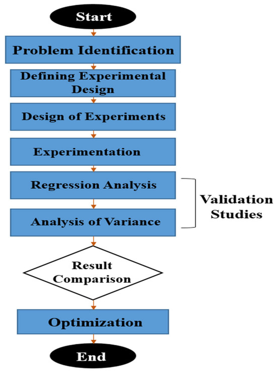 The whole process is pictorially represented in the flowchart in Figure 4 [29]. The comprehensiveness and accuracy of the results have made this statistical optimization technique an integral component for precise result-oriented problems. Lingadurai et al. [30] performed a research study to select the optimized WEDM parameters for AISI grade-304 stainless steel using the full factorial DOE technique.