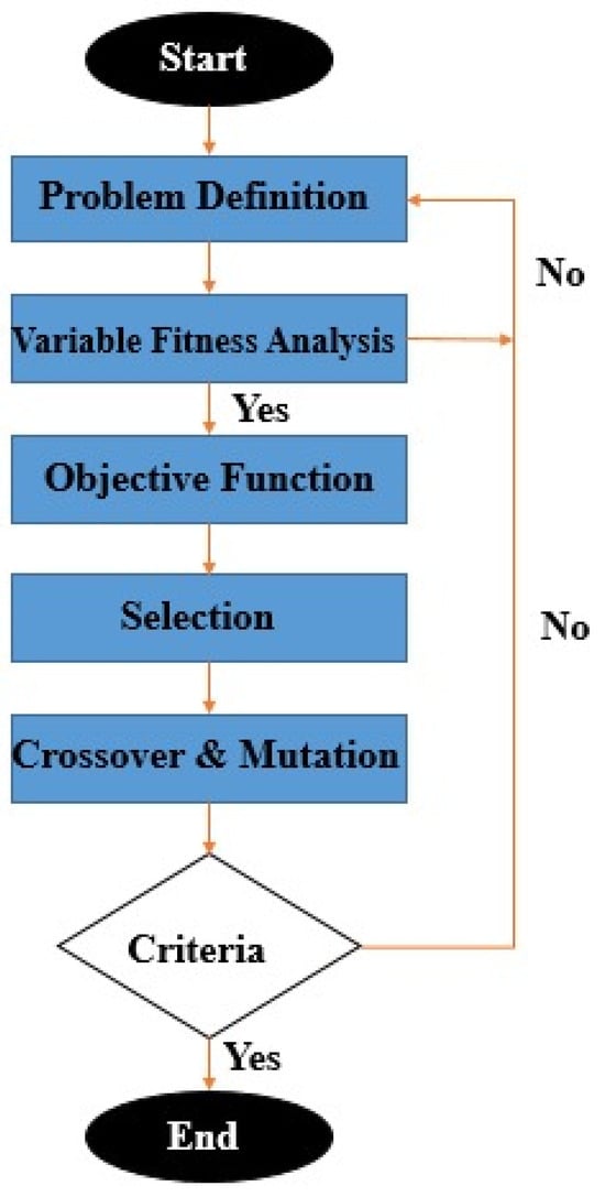 GA is used by default to solve maximization problems. However, GA can be implemented on numerous optimization problems in different supporting software including MATLAB and MINITAB at the top. The complete process flow diagram of GA is shown in Figure 3. Shajan Kuriakose [24] used a very specialized approach called the Non-Dominated Sorting Genetic Algorithm for the multi-parameter optimization of wire EDM. NSGA is used to derive a non-dominated solution set. The importance of the study was the prediction of all the optimal combinations for different objective function values. Mehmet Altug [25] investigated the optimization of differently heat-treated portions of a titanium–aluminum alloy (Ti6Al4V). To study the microstructures and layers, scanning electron microscopy and X-ray diffraction were used. After data collection by various methods, optimization was carried out by the Genetic Algorithm. A fitness function was formed for the respective output to predict the values, which were authenticated by the validation study. Selvam [26] concluded that the voltage and the pulse-off time are the main contributors influencing machining time along with the current, the pulse-on time and the pulse-off time for the surface roughness of Hastelloy C-276. Kuruvila [27] studied dimensional error by the Genetic Algorithm and the Taguchi technique. The mathematical model was developed by a regression equation. A high spark intensity was preferred.