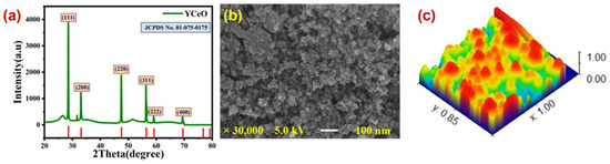 (a) The XRD spectrum; (b) The FE-SEM micrograph at 100 nm; (c) The AFM micrograph of as-prepared YCeO.