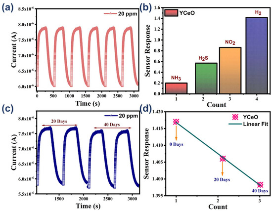 Here, Figure 3a shows the great repeatability of 6 cycles at 20 ppm of H2, which shows excellent repeatability. Sensor selectivity is the ability of a sensor to detect a particular gas in the presence of other gases. In other words, by likening the effects of various gases (oxidizing or reducing) on the sensor response, the selectivity may be calculated. Figure 3b depicts the YCeO gas selectivity towards several gases at room temperature, including NH3, H2S, NO2, and H2. Furthermore, the detected currents of NH3, H2S, and NO2 were low and unstable in comparison to the H2 gas current. In the presence of NH3, H2S, and NO2 gases, it seems that YCeO thin film has the best selectivity towards H2, which confirms that H2 gas molecules are more adsorbent on the surface of YCeO than NH3, H2S, and NO2 gases, as seen in Figure 3b. For sensor optimizations, the long-term stability and repeatability of the sensor are critical partners. A gas sensor’s feature life is also essential to its economic development. By measuring the reactions of the YCeO sensor to 20 ppm H2 at room temperature (28 °C) for 40 days, the sensor’s long-term dependability was investigated, as shown in Figure 3c. The sensor showed extremely little current and response value changes, indicating strong long-term reliability. The sensor indicates that, after 20 and 40 days, the rapid sensor response was 1.40 and 1.39, respectively, as shown in Figure 3d. This result indicates that physisorption, as opposed to chemisorption, dominates the interactivity between the surface of the as-prepared sample and H2 gas. This long-term stability provides additional support for its likely industrial uses.