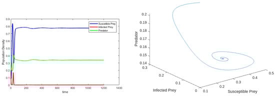 For the given parametric values, as in Table 2 with , the without predator equilibrium point and the endemic equilibrium point exist for . Figure 1 shows time series for the system (Equation (3)) for and phase portrait of the system at . Figure 2 shows susceptible and infected and predator prey population with different values for . It can be observed that an increase in the harvesting rate of susceptible prey leads to a decrease in the susceptible prey and predator population, but an increase in the infected prey population.