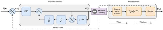 To implement the FOPPI controller presented in Equation (8), it is recommended to set the proportional gain equal to the inverse of the process gain K, i.e., , the integral time equal to the desired integral time T, and a as the order of integration. Figure 2 depicts the FOPPI implementation in the closed-loop wireless sensor network.