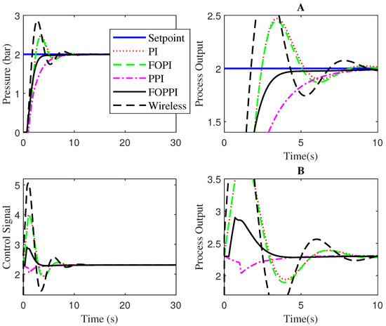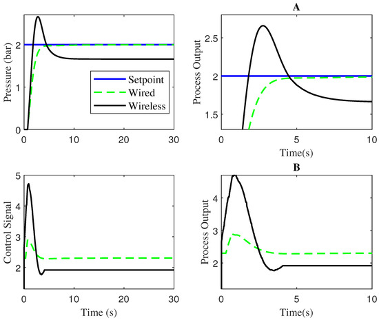 Performance of various controllers in the wired and wireless network ((A)—Zoomed view of pressure; (B)—Zoomed view of control signal).
