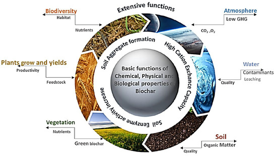 In recent years, all countries of the world think that the ecosystem is under a heavy pollution load. In particular, the increase in population, sectoral developments, and the change in the waste structure with epidemics have led to a dynamic increase in environmental pollution. The ecosystem is dealing with numerous environmental pressures, including increased food and clean water demand, inadequacies in the supply chain, climate change, water scarcity, and soil degradation [1,2]. As a result of anthropogenic activities, constant changes in the environment and epidemics adversely affect the health of living things [3]. In particular, the increasing population and climate change have reduced agricultural areas and caused negativities in agricultural production and soil quality. Soil quality is integrated with the food chain and a clean ecosystem. Quality soil is the most important factor that has a direct impact on safe food and a clean environment. Different pollutant (heavy metals, paint, pesticides, etc.) loads, microbiological activities, climatic and topographic conditions, and current land use can change the properties of the soil. In recent years, fertile agricultural lands have been used in the construction sector. This situation explains the inadequacy between population growth and food supply. Both polluting parameters and non-purpose uses negatively affect soil quality, and alternative solutions are sought for this. One of these solutions is the application of various additives to the soil. Biochar, which is defined as “black gold,” finds a wide application among these additives [4,5]. Lately, it is a widely used additive in agricultural production, soil quality improvement, and treatment of different pollutants in water and soil environments [6,7]. Biochar is based on the preparation of different organic raw materials by various techniques at ≥250 °C and under anoxic conditions [8]. In particular, the application of biochar is important in terms of the management and evaluation of food and agricultural wastes. With the industrial symbiosis approach and zero-waste planning, incorporating a waste as a raw material into the circular environmental process will eliminate waste minimization and waste-related pollution [9,10]. The main objective of this article is to perform a comprehensive review of current studies on biochar. The main criteria of this study are: (i) the production process of biochar, (ii) the composition of the biochar, (iii) effects of the biochar on soil quality, and (iv) environmental pros and cons of biochar.