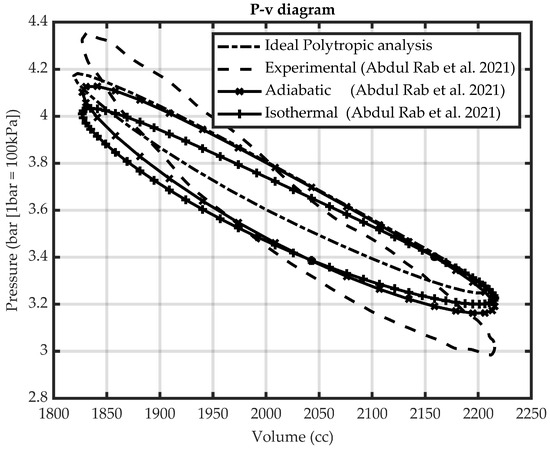 The PV diagram is drawn below for the model validation of the ideal polytropic analysis, and the PV curve is compared with the experimental, adiabatic, isothermal, and ideal polytropic curves. The curve of the new isothermal model is within the range of the experimental curve, as shown in Figure 1. Table 3 compares work, power, and efficiency with the isothermal, adiabatic, experimental, and ideal polytropic methods.