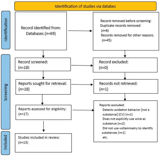 The Preferred Reporting Items for Systematic reviews and Meta-Analyses (PRISMA) guidelines were also observed for the data collection procedure of this study, with the final version shown in Figure 2. The extensive screening was performing to ensure that only relevant and important papers were used in this study; sixty-nine papers were identified from online records. An initial screening was accomplished using the keywords of ‘voltammetry’, ‘wine’, ‘substances’, ‘sensor’, and ‘electrode’; duplicate papers were manually removed from the database alongside papers that do not possess relevant information on the given topic. Once the papers passed the initial screening, they were retrieved for further analysis; only one paper was excluded from the retrieval process (n = 1). The final screening for eligibility was performed by individually reading the abstracts of the screened papers; four papers were excluded from eligibility. This was due to the fact that two papers did not explicitly use voltammetry to identify the compound, another paper did not use wine as the main substance of interest, and the final paper was excluded since the paper solely focused on oxidation levels, instead of tangible substances. To determine the most suitable method of determination for each compound, factors such as voltametric methods, working electrodes, the limit of detection (LOD), and pH levels were reviewed from each paper.