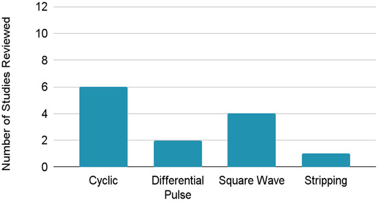 Of the thirteen studies reviewed for wine components, a total of six studies made use of cyclic voltammetry. As shown in Figure 3, two used differential pulses, four used square waves, and one used stripping voltammetry.