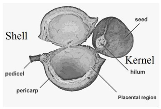 Hazelnut (Corylus avellana) is the most popular nut in the world, especially in the Mediterranean region where it can be used alone or as a food additive. Corylus avellana is of the species Corylus, family of Betulaceae, order Fagales, and clade Rosids. Hazelnut fruit is composed of a soft kernel covered by a thin brown layer and lays inside a hard-smooth inedible outer shell, as shown schematically in Figure 1.