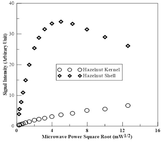 Figure 3 illustrates how altering the microwave power impacts the peak-to-peak amplitude (HPP) of both the hazelnut kernel signal (Sb) and the shell signal (Sc). As depicted in the figure, the Sb demonstrates a linear growth until reaching a microwave power of 4 mW. Afterward, saturation begins, leading to a nonlinear rise in HPP that persists until the upper limit of the investigated range (160 mW).