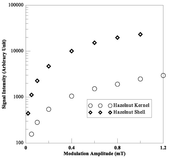 The EPR measurements for hazelnut shells and kernels were conducted with the following parameters: a microwave power of 2.012 mW, a central field set at 344.8 mT, a sweep width of 50.0 mT, a time constant of 163.84 ms, and a conversion time of 81.92 ms. These parameters resulted in 1024 data points per spectrum, and the entire sweep took approximately 84 s. The modulation amplitudes were 1.9 mT for shells and 0.8 mT for kernels, with a modulation frequency of 100 kHz. To ensure signal accuracy, empty-tube spectra were recorded prior to recording the spectra of the hazelnut samples.