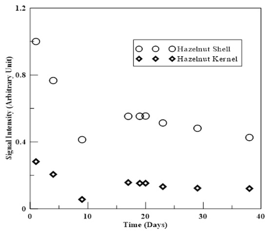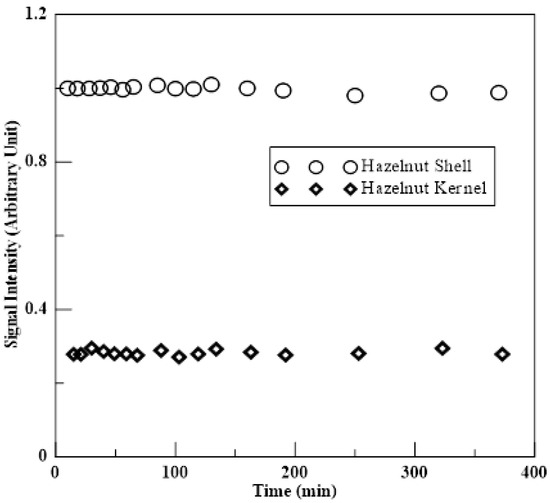 The time dependence of HPP for both kernel and shell signals was monitored closely over the first six hours after irradiation terminates in order to trace the dynamics of the radiation-induced radicals. During the first hour after irradiation, HPP was stable within 2.4% for kernels and 0.80% for shells, while during the second hour it was stable within 2.7% and 1.6% and within 2.6% and 2.7% during the following four hours after irradiation for kernels and shells, respectively, time dependence for radiation-induced radicals in hazelnut kernel and shell over the first six hours following the irradiation process is plotted in Figure 5.