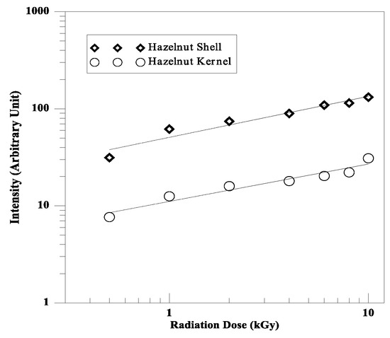 - Maghraby, A.; Salama, E.; Sami, A.; Mansour, A.; El-Sayed, M. Identification and dosimetry of irradiated walnuts (Juglans regia) using EPR. Radiat. Eff. Defects Solids 2012, 167, 170–178. [Google Scholar] [CrossRef]